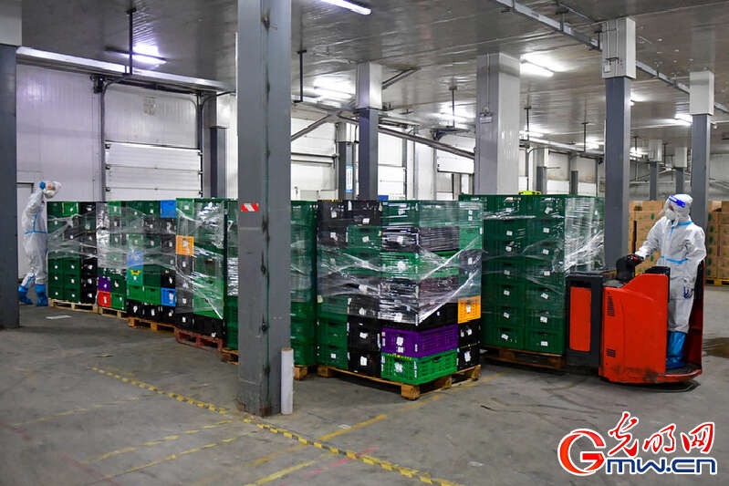 2022年4月14日,上海市普陀区一处物流园,物流工作人员在运送新到货的蔬果。(田雨昊 摄/光亮图片/视觉我国)